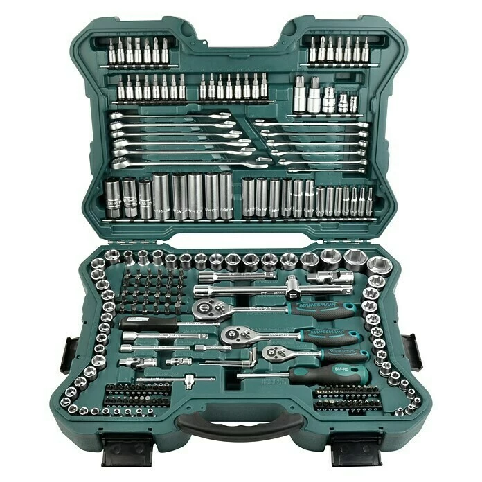 Der 215-teilige Steckschlüssel-Satz von Brüder Mannesmann gehört zur Green Line Premium Werkzeug-Serie und ist die Komplettlösung für alle anfallenden Schraubarbeiten in der Werkstatt, am Motorrad und Fahrrad sowie zu Hause. Gefertigt ist der Satz aus Chrom-Vanadium und Spezialstahl. Der robuste Kunststoffkoffer gewährleistet eine sichere Aufbewahrung aller Werkzeuge.