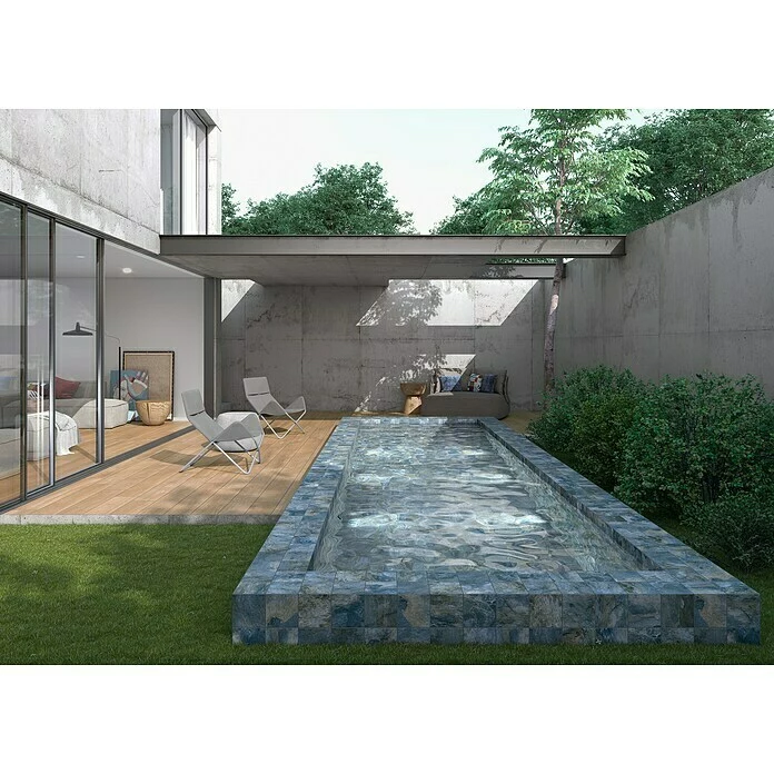 Die glasierte Feinsteinzeugfliese Splash Azur zeichnet sich durch ein besonders modernes Design aus. Durch das spezielle Herstellungsverfahren wiederholt sich das Muster nur selten und vermittelt somit eine elegante Atmosphäre. Die Fliese, welche eine glatte, glasierte Oberfläche besitzt, kann sowohl an der Wand als auch auf dem Boden verlegt werden. Des Weiteren eignet sich ihre Rutschsicherheit gut für den Außen- und Nassbereich. Wir empfehlen eine Verlegung versetzt im Drittelverband.