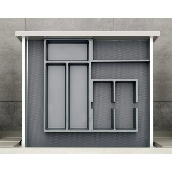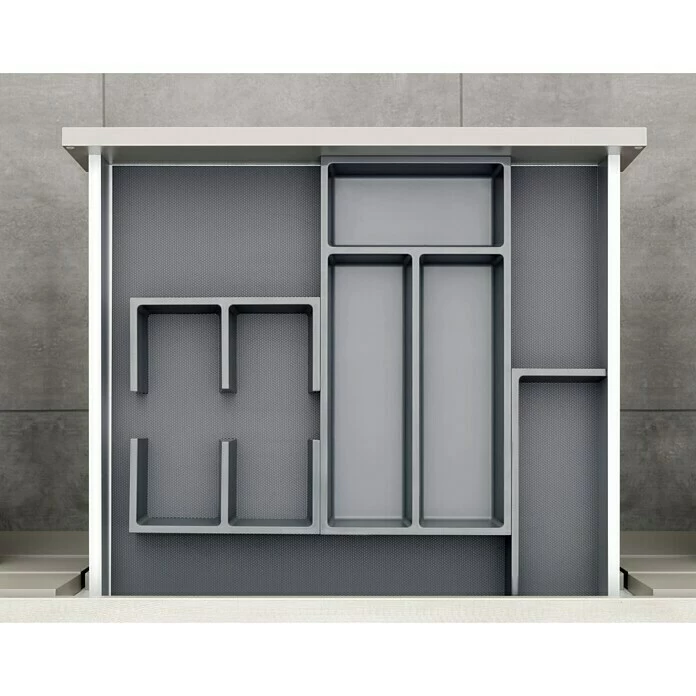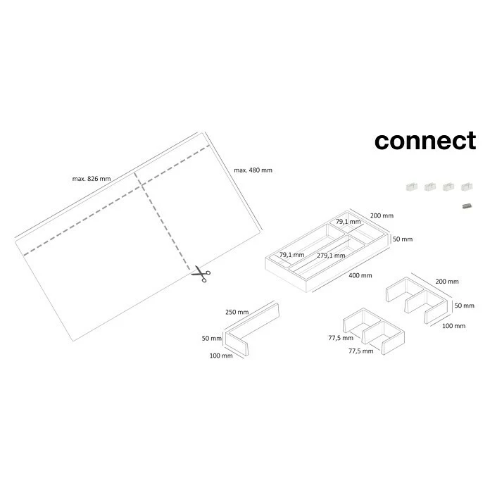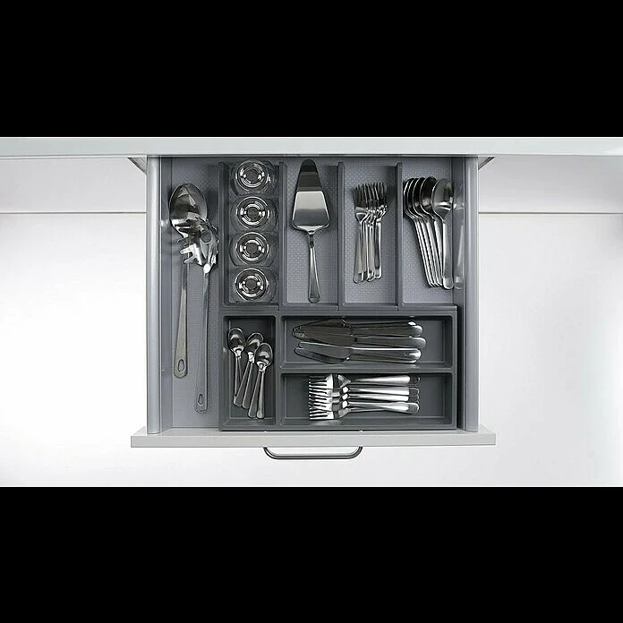 Der essensa Schubladeneinsatz connect schafft Ordnung in Schubladen. Das System besteht aus verschiedenen Elementen, die beliebig miteinander verbunden werden können. So können Schubkästen verschiedener Tiefen und Breiten optimal organisiert werden. Die einzelnen Elemente werden auf der Unterseite mit connectoren verknüpft, die beim Einsatz des Systems im Schubkasten nicht mehr sichtbar sind. Das Basisset besteht aus 1 x Schale 40/20, 1 x Winkel links 25/10, 2 x 2-fach Unterteilung, 4 x Connectoren, 1 x Anti-Rutsch Matte (82,6 x 48 cm) und einer Befestigungsklammer.