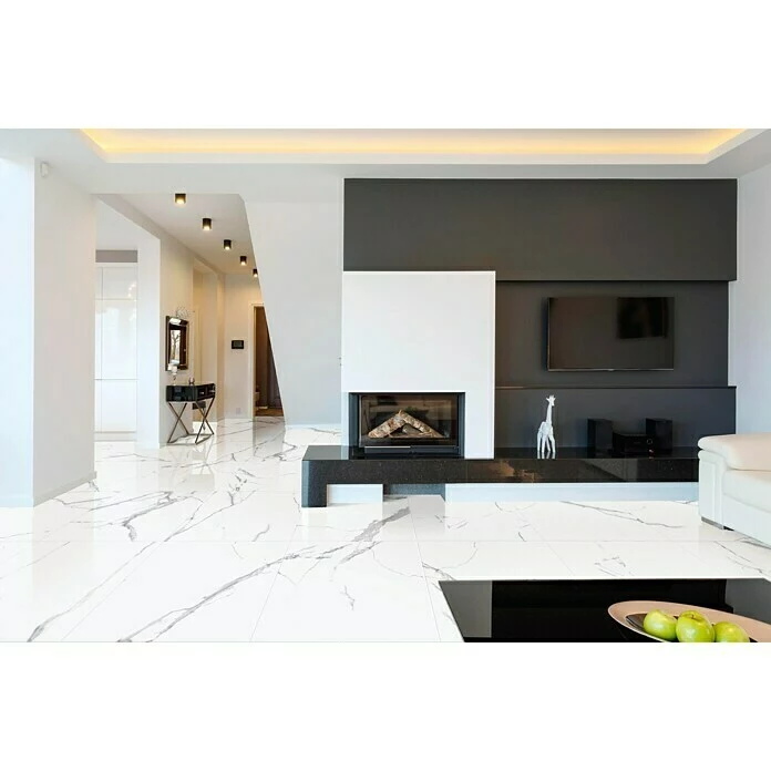 Die glasierte und polierte Feinsteinzeugfliese Calacata ist ein besonders robuster und widerstandsfähiger Bodenbelag. Die einzigartige Marmorstruktur macht diese attraktive Bodenfliese zu einem Blickfang im großen Stil. Des Weiteren ist die Fliese, im Vergleich zu herkömmlichen Fliesen, aufgrund der Fliesenstärke von lediglich 6mm, wesentlich leichter. Die Oberfläche ist glasiert und somit ist eine zusätzliche Versiegelung oder Imprägnierung nach der Verlegung nicht notwendig.