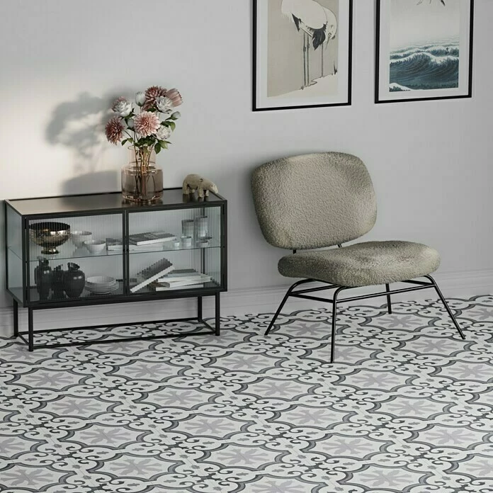 Die Fliese im Vintage Look ist ein historisches Feinsteinzeug mit Jugendstil-Ornamenten und bietet für jeden Geschmack eine wunderbare Basis für die individuelle Raumgestaltung. Die Kombination zwischen dem modernen Effekt aus Zementoptik und dem zeitlosen Stil der alten Tradition der Mixdekoration, verleiht Ihrem Wohnzimmer, Ihrer Küche oder sogar Ihrer Terrasse eine einzigartige Atmosphäre.