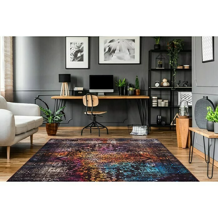 Der Kayoom Flachgewebeteppich Galaxy ist ein wahrer Blickfang mit Vintage-Charme. Stiltypische Verwaschungen und eine harmonische Gestaltung aufeinander abgestimmter Farben machen den Teppich zu einem traumhaften Bodenbelag. Inbesondere moderne und neutrale Einrichtungenstile werden durch dieses Teppichmodell besonders gut ergänzt. Auch in eher klassisch angehauchten Einrichtungen ist der Flachgewebeteppich eine bereichernde Ergänzung. Der Vintage-Charakter kann durch die Kombination mit weiteren Details im Vintage-Stil noch verstärkt werden. Wohnaccessoires, Dekoelemente oder auch Möbel gibt es in verschiedenen Ausführungen mit Vintage- oder Retro-Optik, sodass sich für jede Einrichtung etwas Passendes findet. Das pflegeleichte Material des flachen Gewebes bleibt auch bei häufiger Nutzung lange Zeit erhalten. Auch in Räumen mit Fußbodenheizungen kann der Teppich platziert werden. Ein Filzstoff-Rücken verstärkt den Flor und schont zugleich den Boden.