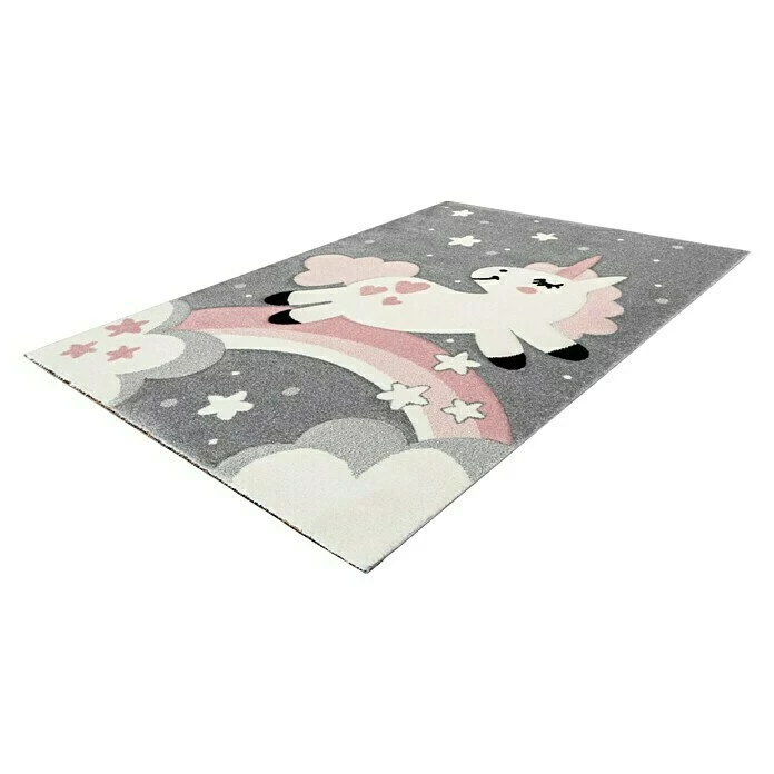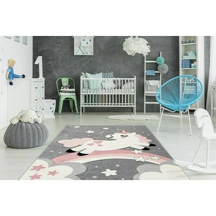 Der Kayoom Kurzflorteppich Einhorn mit Regenbogen ist ein Kinderzimmerteppich mit tollem Design. Dieser attraktive Spielteppich ist optimal für das Kinderzimmer von heute geeignet. Das verspielte, kindgerechte Motiv und die dezenten Farben eignen sich ideal als Spieluntergrund und lassen Kinderaugen strahlen. Er bietet einen weichen Grundfläche, auf dem Kinder sichtbare Freude haben werden. Ein großer Vorteil ist auch das pflegeleichte Material und die robuste Qualität dieses Kinderteppichs. Gerade im Kinderzimmer sind diese Eigenschaften empfehlenswert. Er hält hoher Beanspruchung und Verschmutzungen stand, sodass Kinder lange Zeit Freude an dem neuen Bodenbelag haben.