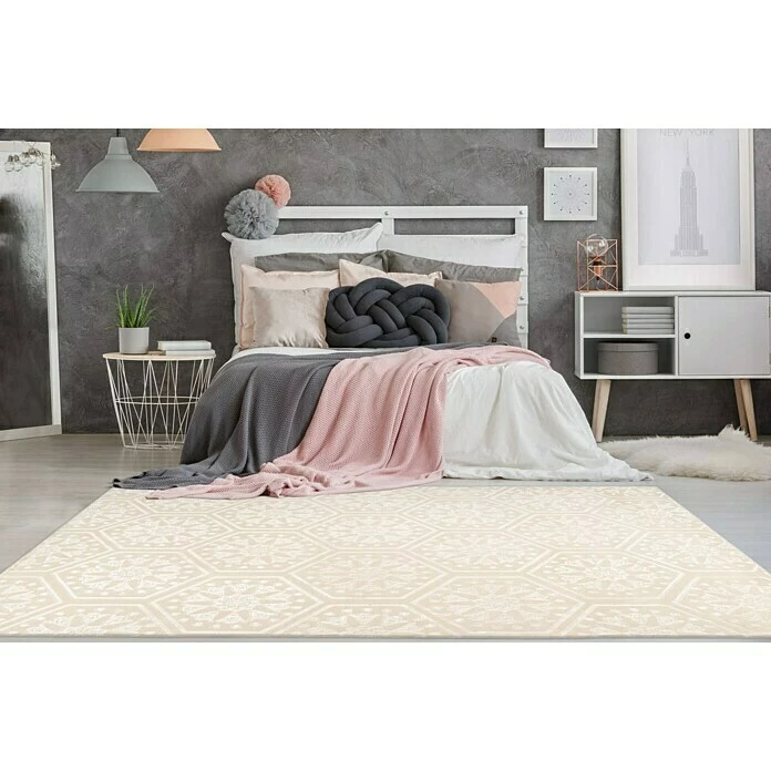 Der Kayoom Kurzflorteppich Monroe in mit einem geprägtem Muster designed. Dieses Teppichmodell ist ein ganz besonderes Schmuckstück und unterstreicht eine luxoriöse Innenraumgestaltung. Der einfarbige Kuschelflor ist mit einem Prägedruck versehen, der für eine zweifarbige Wirkung sorgt und gleichzeitig einen 3D-Effekt generiert. Durch die niedrigeren geprägten Fasern entstehen Höhen und Tiefen in der Oberfläche, die dem Teppich zu seiner besonderen Optik verhelfen. Rundherum ist der Teppich gekettelt, wodurch ein Ausfransen verhindert und gleichzeitig das Gesamtbild abrundet wird. Das stilvolle Design passt in nahezu jeden Einrichtungsstil und sorgt in den Wohnräumen für angenehme Wohlfühlatmosphäre. In der Haptik fühlt sich der Flor an wie echtes Kaninchenfell und ist somit besonders weich und komfortabel. Durch den Baumwollrücken mit Anti-Rutsch-Noppen wird unerwünschtes Verrutschen des Teppichs verhindert. So kann er optimal als Vorleger vor dem Bett im Schlafzimmer genutzt werden, um direkt beim Aufstehen das angenehme Gefühl unter den Füßen spüren zu können. Aber auch für gemütliche Stunden vor dem Kamin ist dieser Teppich optimal geeignet. In der passenden Kombination mit Heimtextilien und stimmiger Beleuchtung schafft dieser moderne Kurzflorteppich eine kuschelige und gemütliche Atmosphäre – nicht nur vor dem Kamin.