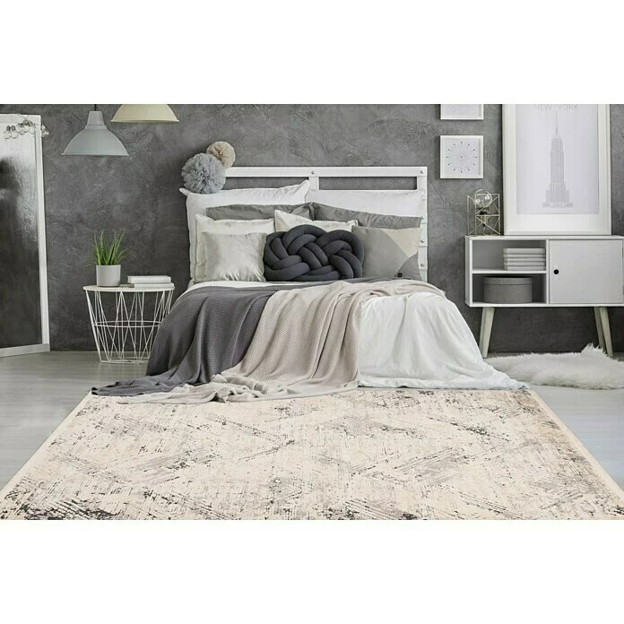 Der Kayoom Kurzflorteppich Palace ist ein attraktiver Teppich mit Vintage-Charme. Durch die zeitlose Farbgebung und moderne Gestaltung integriert sich dieser Teppich in vielerlei Einrichtungsstile und setzt sowohl Möbel als auch andere Einrichtungsgegenstände dekorativ in Szene. Typische verwaschene Bereiche sind bei diesem Vintage-Teppich besonders ausgeprägt und unterstreichen eine trendbewusste Wohnraumgestaltung. Weiche Fransen an den Teppichenden runden das Gesamtbild stilvoll ab. Der Teppich hat einen weichen, kreuzgewebten Flor, welcher angenehmen Wohnkomfort unterstützt. Palace kreiert ein gemütliches Ambiente im jedem Raum. Auf kalten Fliesen oder Laminat unterstützt er Barfußläufer sehr komfortabel. Wärmere Bodenbeläge wie beispielsweise Holz oder Räume mit Fußbodenheizung sind jedoch ebenfalls ein idealer Ort, um den neuen Teppich mit Vintage-Charme zu platzieren. Verstärkt ist der Flor mit einem Baumwollrücken.