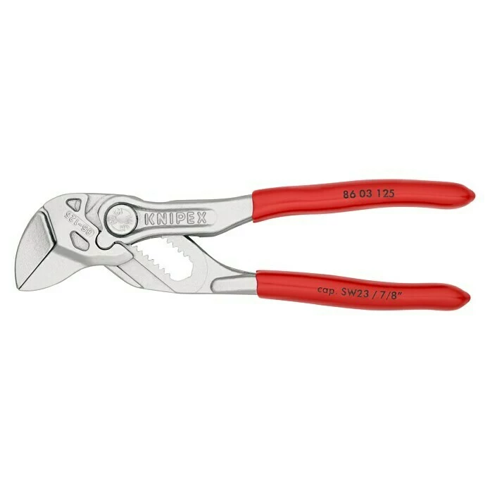 Der Zangenschlüssel von Knipex findet als 2in1 Werkzeug zahlreiche Anwendungsmöglichkeiten in Werkstatt- und Heimwerkerbereich. Als Schraubwerkzeug ersetzt er einen kompletten Schraubenschlüsselsatz. Die Schlüsselweite lässt sich direkt am Werkstück per Knopfdruck einstellen. Der sicher einrastende Bolzen verhindert eine unbeabsichtigte Verstellung. Die Zange kann auch zum Greifen, Halten, Pressen und Biegen verwendet werden. Bei all diesen Anwendungen wird mit den glatten Backen für schonendes Arbeiten an empfindlichen, oberflächenveredelten Armaturen gesorgt. Durch seine kompakte Form eignet sich dieses Werkzeug besonders gut für alle feinen Arbeiten, z. B. an kleinen Verschraubungen. Darüber hinaus bietet solch ein kompaktes Werkzeug gute Zugänglichkeit der schwer erreichbaren Stellen.