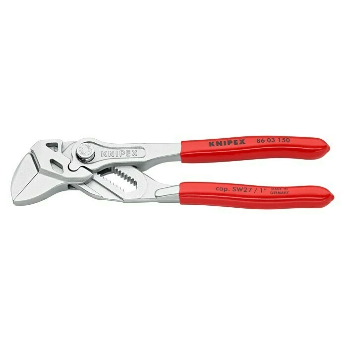 Der Zangenschlüssel von Knipex mit einer Länge von 150 mm findet als 2in1 Werkzeug zahlreiche Anwendungsmöglichkeiten in Werkstatt- und Heimwerkerbereich. Als Schraubwerkzeug ersetzt er einen kompletten Schraubenschlüsselsatz, metrisch wie zöllig. Die Schlüsselweite lässt sich direkt am Werkstück per Knopfdruck einstellen. Der sicher einrastende Bolzen verhindert eine unbeabsichtigte Verstellung. Die Zange kann auch zum Greifen, Halten, Pressen und Biegen verwendet werden. Bei all diesen Anwendungen wird mit den glatten Backen für schonendes Arbeiten an empfindlichen, oberflächenveredelten Armaturen gesorgt. Der Hub zwischen den Greifbacken ermöglicht schnelles Anziehen und Lösen von Schraubverbindungen nach dem Ratschenprinzip, ohne dass die Zange abgesetzt werden muss. Durch seine kompakte Form eignet sich dieses Werkzeug besonders gut für alle feinen Arbeiten, z. B. an kleinen Verschraubungen. Darüber hinaus bietet solch ein kompaktes Werkzeug gute Zugänglichkeit zu schwer erreichbaren Stellen.
