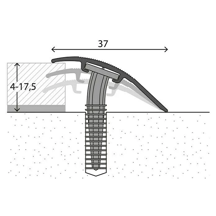 Das LOGOCLIC Anpassprofil wird mit Nylon-Lamellendübeln verdeckt befestigt. Ins Bohrloch eingetrieben, krallen sich die Lamellen an der Bohrlochwand fest und sorgen für dauerhaften Halt. Zugleich bewirkt die Elastizität des Dübels, dass sich das Profil in Höhe und Neigung dem Bodenbelag und Niveauunterschieden anpassen kann. Im Gegensatz zu Profilen mit vorgegebenen Bohrlöchern, können die Bohrlöcher dort gesetzt werden, wo die Haltekräfte benötigt werden, z.B. in Laufstraßen. Da das Profil ohne Basisprofil verarbeitet wird, ist es die ideale Lösung, um Dehnungsfugen im Bodenbelag nachträglich zu schließen.