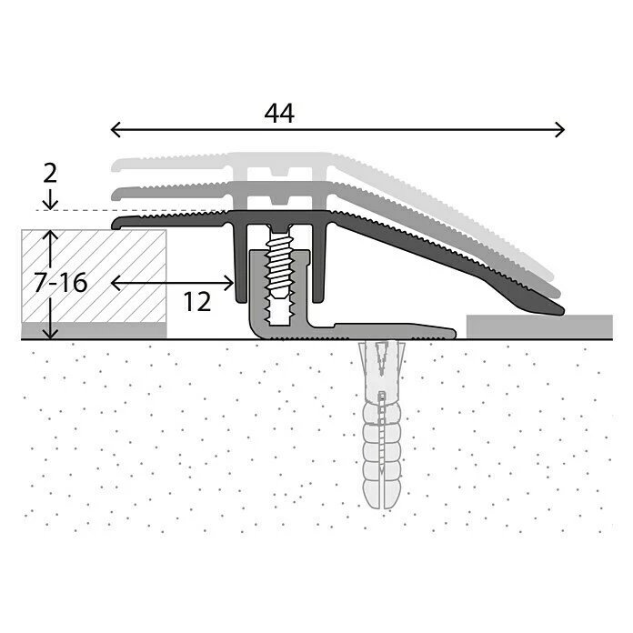 Das LOGOCLIC Anpassprofil ist für die Verarbeitung von Laminat und Parkett mit Belagstärken von 7 – 16 mm geeignet. Das bewährte Schraubprofilsystem ist schnell und einfach zu verarbeiten. Zunächst wird das Basisprofil auf dem Untergrund verschraubt und der Boden verlegt. Danach wird das Oberprofil aufgelegt. Die beiden Stege greifen über den Schraubkanal des Basisprofils, mit den beigefügten Schrauben wird es im Schraubkanal befestigt.
