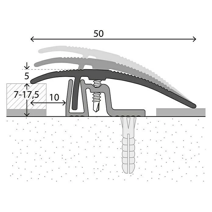 Das LOGOCLIC Anpassprofil ist für die Verarbeitung von Laminat und Parkett mit Belagstärken von 7 – 17,5 mm konstruiert. Es überzeugt durch die zeitsparende und einfache Verarbeitung. Zunächst wird das Basisprofil auf dem Untergrund verschraubt und der Bodenbelag verlegt. Dabei ist eine ausreichende Dehnungsfuge zu berücksichtigen. Das Oberprofil passt sich stufenlos dem Bodenbelag an. Auch bei starken Niveauunterschieden schließt es automatisch dicht an beiden Seiten ab. Mit den beigefügten Selbstbohrschrauben wird das Oberprofil im Basisprofil befestigt. Der Rundumkontakt der Schraube garantiert einen optimalen Kraftschluss, auch nach mehrjähriger Druck- und Zugbelastung entsteht kein Spiel. Aufgrund der starken, dauerhaften Verbindung ist das Profilsystem für höchste Belastungen geeignet.