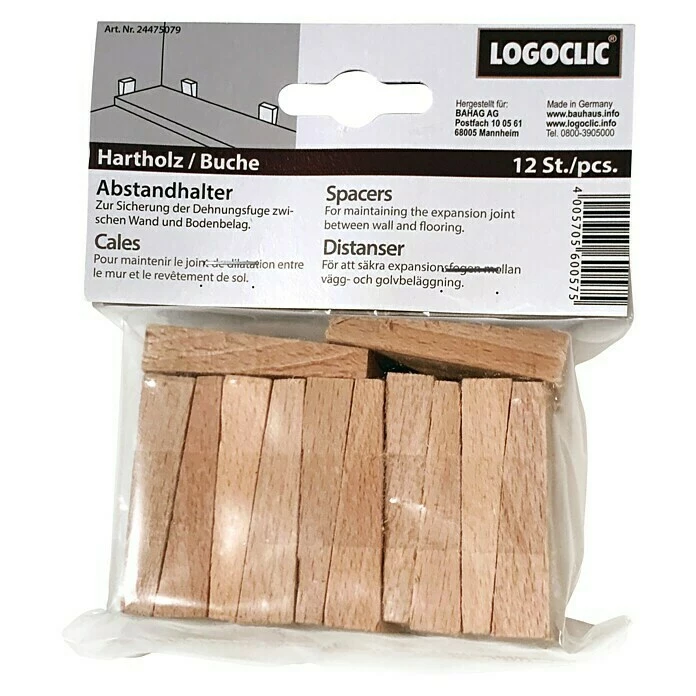 Die LOGOCLIC Abstandskeile sind aus massivem Buchenholz gefertigt und dienen der Fixierung von schwimmend verlegten Bodenbelägen. Um den erforderlichen Randabstand von ca. 12 – 15 mm zur Wand, zu Heizungsrohren, Pfeilern, Türstoppern etc. zu gewährleisten, sind die Holzkeile unerlässlich. Nach der Verlegung müssen diese wieder entfernt werden.