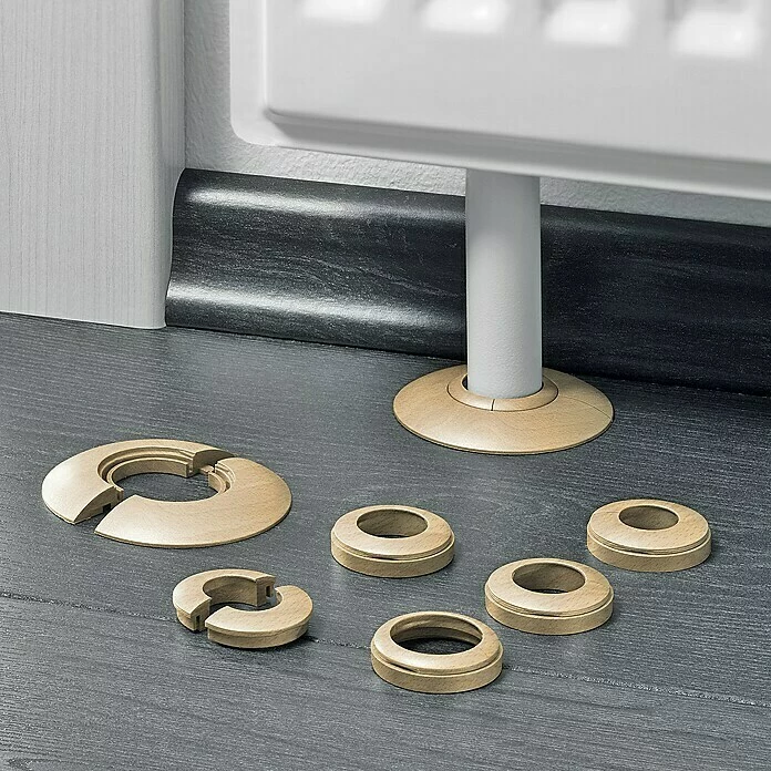 Die Rohrrosette von LOGOCLIC dient der perfekten Abdeckung der Dehnungsfuge um das Heizungsrohr. Sie besteht aus langlebigem, bedrucktem Kunststoff und fügt sich dezent in den Raum ein. Mit den drei Adaptern für 15, 18 und 22 mm lässt sich ganz einfach der richtige Durchmesser erzielen.