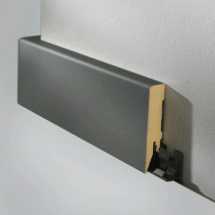 Die Sockelleiste von LOGOCLIC® mit ihrer klaren Form und hochwertigen Verarbeitung ist ein ausdrucksvolles Element für das designorientierte Einrichten. Die aus massivem Trägermaterial gefertigte Leiste ist mit einer Dekorfolie in Anthrazit ummantelt. Separat erhältliche Montageclips garantieren eine einfache Befestigung und lassen eine versteckte Kabelverlegung zu.