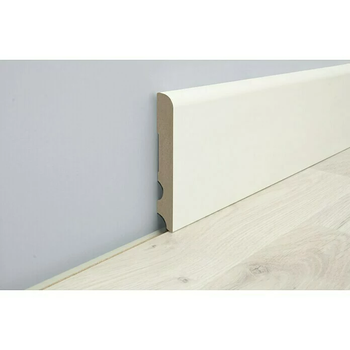 Die schlagbeständige weiße Sockelleiste von LOGOCLIC® setzt gezielt Akzente. Der MDF-Kern der Leiste bietet ausreichend Stabilität sowie Flexibilität. Mit dieser einseitig abgerundeten Trendleiste werden neue Maßstäbe im Einrichtungsbereich gesetzt.