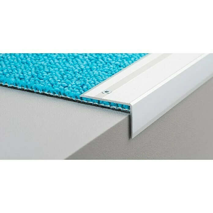 Das LOGOCLIC Treppenkantenprofil schützt zuverlässig die Kanten des Bodenbelags auf der Stufenkante. Versenkte Schraublöcher ermöglichen eine dauerhafte Befestigung des Winkelprofils. Die gerillte Oberfläche erhöht zusätzlich die Sicherheit auf der Trittfläche.