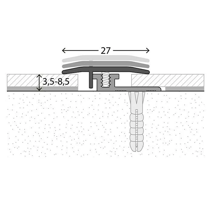 Das LOGOCLIC Übergangsprofil wurde für die Verarbeitung von schwimmend verlegten Designbelägen konstruiert. Es passt sich Aufbauhöhen bis 8,5 mm automatisch an und kann daher auch für andere Bodenbelagsarten mit ähnlichen Stärken verwendet werden. Die Montage ist einfach und schnell. Nach der Verschraubung des Basisprofils auf dem Untergrund erfolgt die Verlegung des Bodenbelages. Mit den beigefügten Schrauben wird das Oberprofil anschließend im Schraubkanal befestigt, fertig. Die schmalen, flachen Profile überzeugen durch eine perfekte Optik und bieten gleichzeitig großzügige Dehnungsfugen für die Dimensionsschwankungen des Bodenbelages.