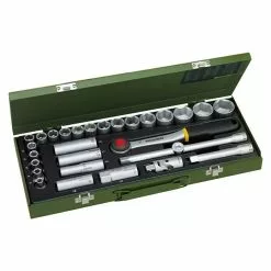 Der Proxxon Industrial Steckschlüsselsatz kommt im stabilen, pulverbeschichteten Stahlkasten. Eine Tabelle für Gewinde von M 1,6 – M 24 mit Anzugsdrehmomenten ist im Deckel dauerhaft fixiert. Die Werte für Härte und maximales Drehmoment sind besser als von DIN/ISO gefordert. Die Maßhaltigkeit liegt innerhalb der zugelassenen Toleranzen. Der Stahlkasten besitzt verwindungsfeste, unverwüstlichen Formeinlage aus gespritztem POLYPROPYLEN. Zudem ist er ölfest, säurefest, und leicht zu reinigen. Dank der dauerhaft gut lesbaren Markierungen für alle Schlüsselweiten ist das benötigte Werkzeug leicht zu finden.