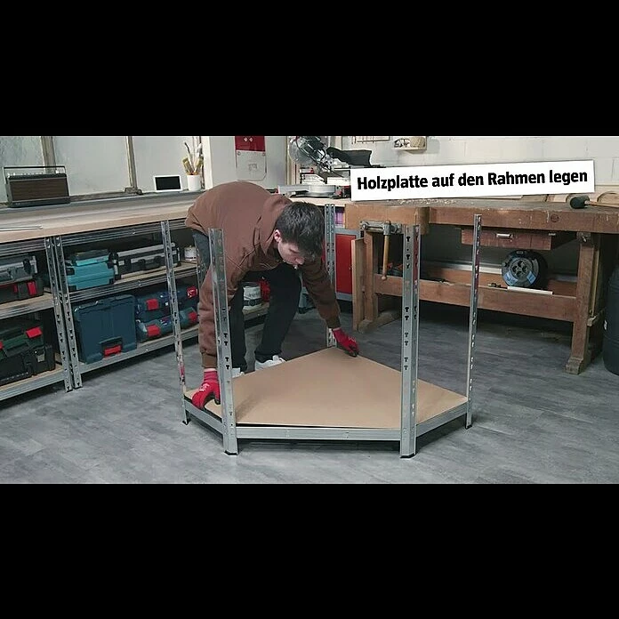 Dank des praktischen Stecksystems lassen sich die Regale schnell und einfach, ohne Schrauben montieren. Dabei sorgen die unter den Böden aus Holzwerkstoff montieren Traversen für zusätzliche Stabilität. Obwohl die Montage werkzeuglos erfolgen kann geht es mit einem Gummihammer deutlich einfacher. Daher empfehlen wir Ihnen die Verwendung eines Gummihammers der BAUHAUS Qualitätsmarke Wisent.