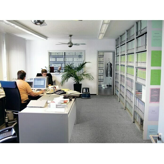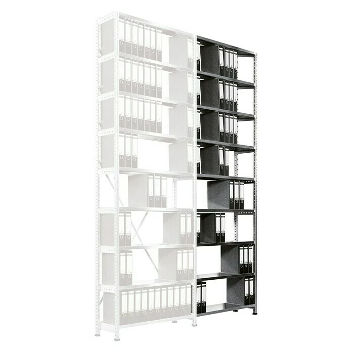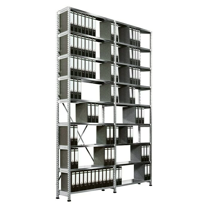 Das Metallregal von Scholz gibt Ihnen die Möglichkeit, auf geringer Grundfläche den größtmöglichen Stauraum in Anspruch zu nehmen. Das Regal bietet auf 9 Regalböden passgenauen Stauraum für Aktenordner oder andere einzulagernde Artikel. Jeder Regalboden erbringt eine Tragkraft von 90 kg. Das Regal besteht aus Metall und ist verzinkt. Somit erbringt es die höchstmögliche Belastbarkeit und Lebensdauer. Die Böden lassen sich über die Verstellraster im 30 mm Abstand variieren. Die Ecken des Regales sind abgerundet, sodass bei einem möglichen Zusammenstoß keine Verletzungen entstehen. Das Regal eignet sich als Anbau für ein Grundregal.