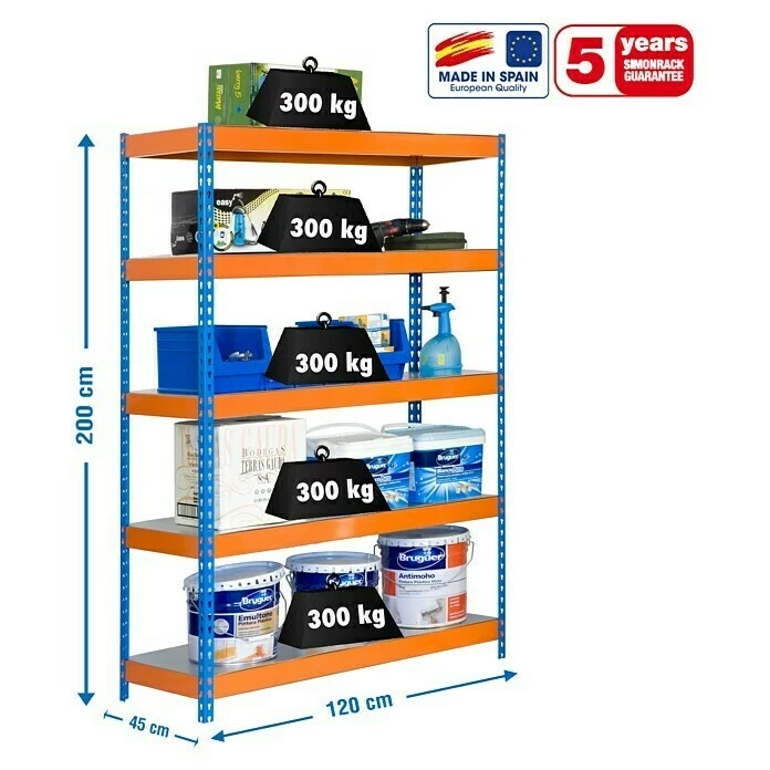 Das Schwerlastregal Bricoforte von Simonrack kann bei gleichmäßig verteilter Last bis zu 300 kg pro Fachboden tragen. Er ist starr und wackelt nicht. Außerdem lässt er sich in kürzester Zeit montieren. Das Regal kann auf Rollen montiert werden und eignet sich perfekt für die Werkstatt, da es speziell für die Lagerung schwerer Produkte auf den Regalböden konzipiert ist.