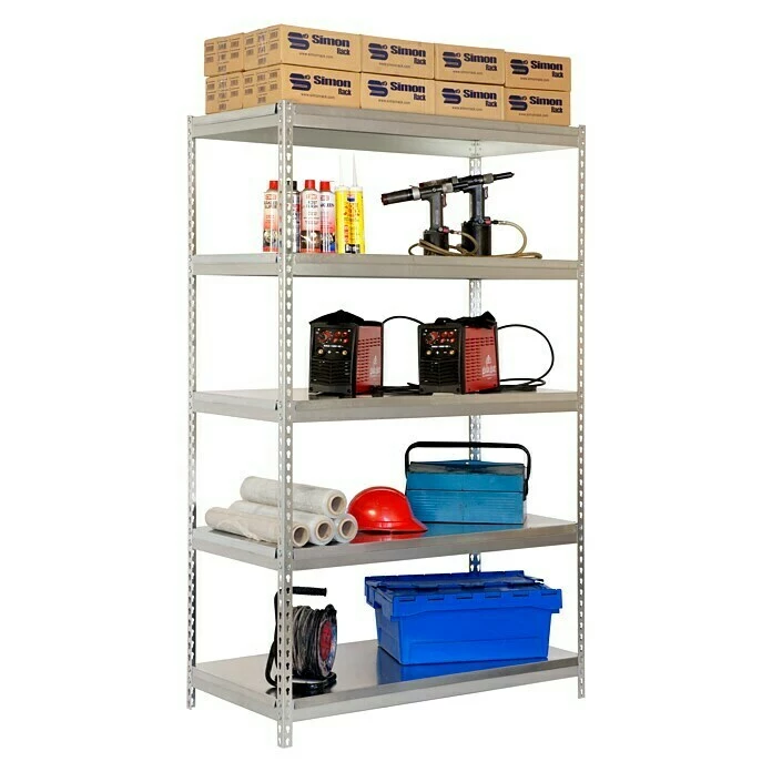 Das Schwerlastregal Bricoforte von Simonrack kann bei gleichmäßig verteilter Last bis zu 300 kg pro Fachboden tragen. Er ist starr und wackelt nicht. Außerdem lässt er sich in kürzester Zeit montieren. Das Regal kann auf Rollen montiert werden und eignet sich perfekt für die Werkstatt, da es speziell für die Lagerung schwerer Produkte auf den Regalböden konzipiert ist.