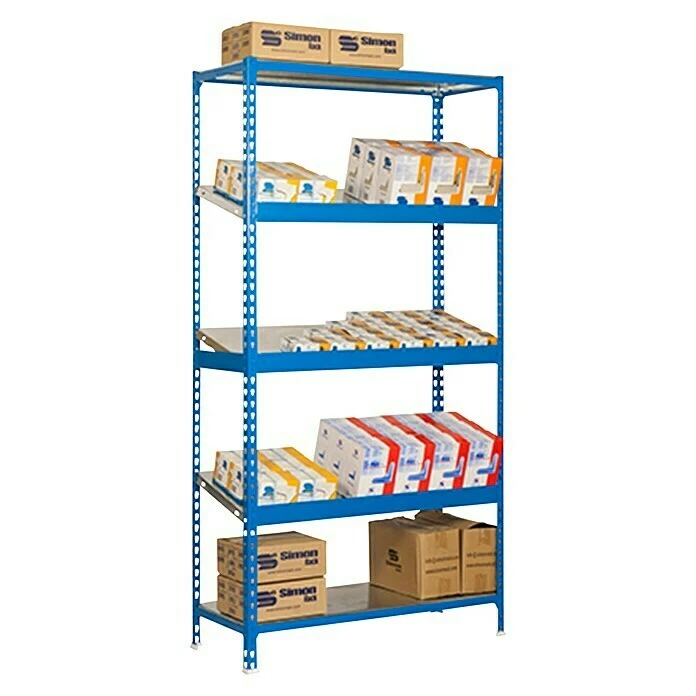 Das Simonexpo Simonclick Metallregal von Simonrack ist einfach und ohne Schrauben zu montieren. Es hat eine Tragfähigkeit von 200 kg pro Boden bei gleichmäßiger Gewichtsverteilung. Dieses Regal ermöglicht die Montage der Böden in drei verschiedenen Positionen: in normaler Position, gedreht für rollende Gegenstände und geneigt für eine bessere Präsentation von Gegenständen. Die Höhe der Einlegeböden kann leicht verändert werden, ohne dass sie demontiert werden müssen. Die Vorderseiten eignen sich perfekt für die Präsentation von Material.