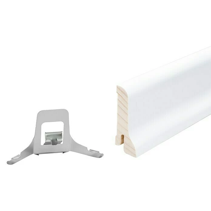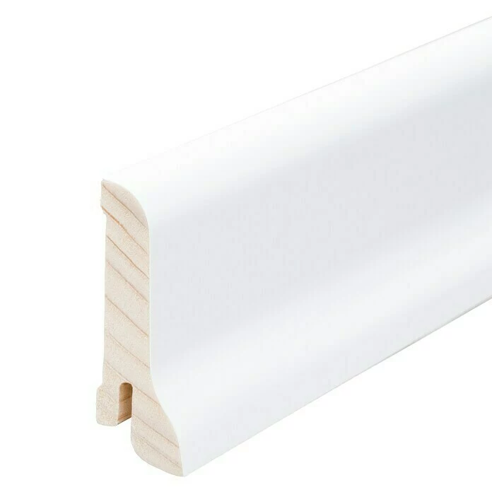 Diese Sockelleiste ist ein echtes Premiummodell mit geschwungenem Profil. Weiße Fußleisten erfreuen sich großer Beliebtheit und passen insbesondere zu modernen Einrichtungsstilen. Die Leiste ist mit Starkfolie ummantelt und verfügt über einen Kern aus massivem Fichtenholz. So ist sie äußerst robust. Zur Erleichterung der Montage dient eine rückseitige Clip-Nut.
