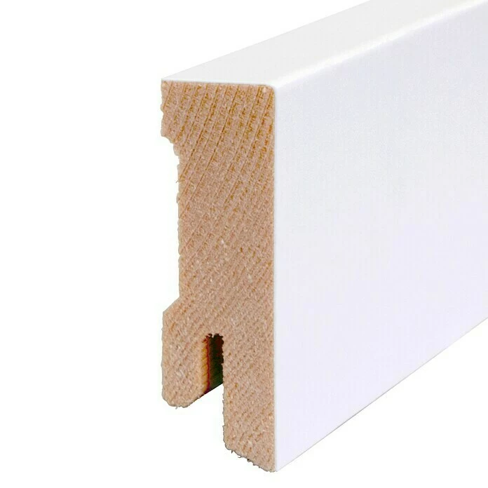 Die Sockelleiste aus einem hochwertigen Fichtenholzkern ist von einer Starkfolie in klarem, reinem Weiß ummantelt. Das Ergebnis ist eine besonders robuste, langlebige Leiste, die mit einem schlichten, puristischen Look punktet. Dieser wird durch ihr modernes, eckiges Profil noch verstärkt, da dieses zu vielerlei Einrichtungsstilen passt. Einen praktischen Vorteil bietet die Clip-Nut der Sockelleiste. Damit ist eine einfache und verdeckte Montage möglich.