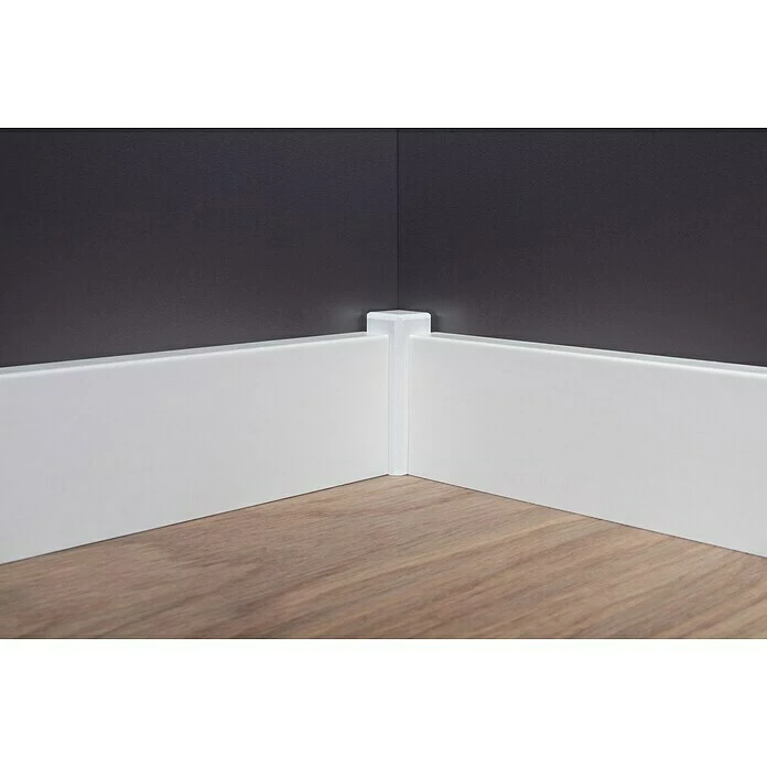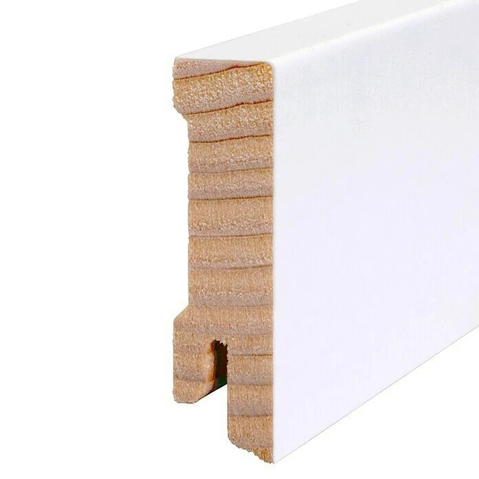 Die Sockelleiste aus einem hochwertigen Fichtenholzkern ist von einer Starkfolie in klarem, reinem Weiß ummantelt. Das Ergebnis ist eine besonders robuste, langlebige Leiste, die mit einem schlichten, puristischen Look punktet. Dieser wird durch ihr modernes, eckiges Profil noch verstärkt, da dieses zu vielerlei Einrichtungsstilen passt. Einen praktischen Vorteil bietet die Clip-Nut der Sockelleiste. Damit ist eine einfache und verdeckte Montage möglich.