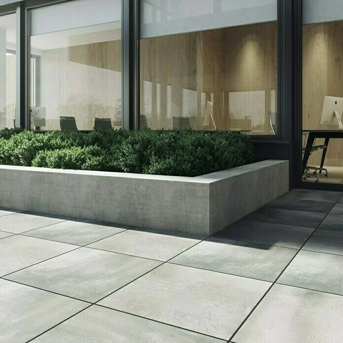 Mit der modernen Feinsteinzeugfliese Beton lassen sich problemlos Wohnlandschaften im Innen- und Außenbereich realisieren. Die Serie vereint die Vorteile aus zwei verschiedenen Ausführungen miteinander. Den legeren Look des Betons mit den Verlege- und Pflegevorzügen der Fliese macht diese attraktive Bodenfliese zu einem Blickfang im großen Stil. Die Platte besitzt eine extrem niedrige Porosität und Wasseraufnahme, weshalb sie auch frostbeständig ist. Die hohe Dichte des keramischen Materials gewährleistet eine gute Strapazierfähigkeit und intensive Nutzung trotz geringer Stärke. Zudem ist die Fliese UV- und witterungsbeständig.