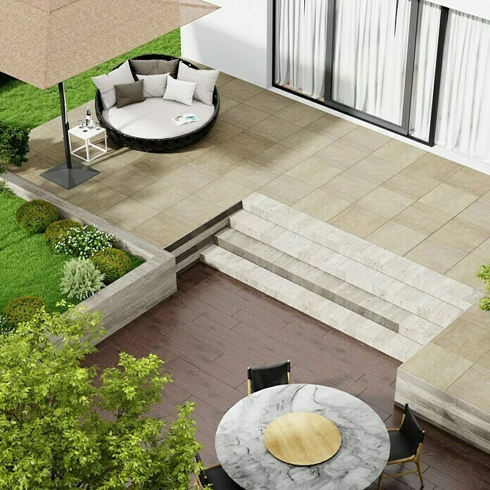 Die unglasierte Feinsteinzeugfliese Terrassimo ist der ideale Allrounder für Terrasse, Balkon und Garten. Die Fliese wird aus natürlichen Rohstoffen hergestellt, ist schadstofffrei und raumluftneutral und eignet sich somit optimal für Allergiker. Die rutschhemmenden Eigenschaften R11 machen sie zum perfekten Allrounder. Vielfältige Verlegearten, wie loses Verlegen auf Split, Gras, Kies oder auf Stelzlager sowie klassisches Verkleben lassen viele Gestaltungsspielräume.