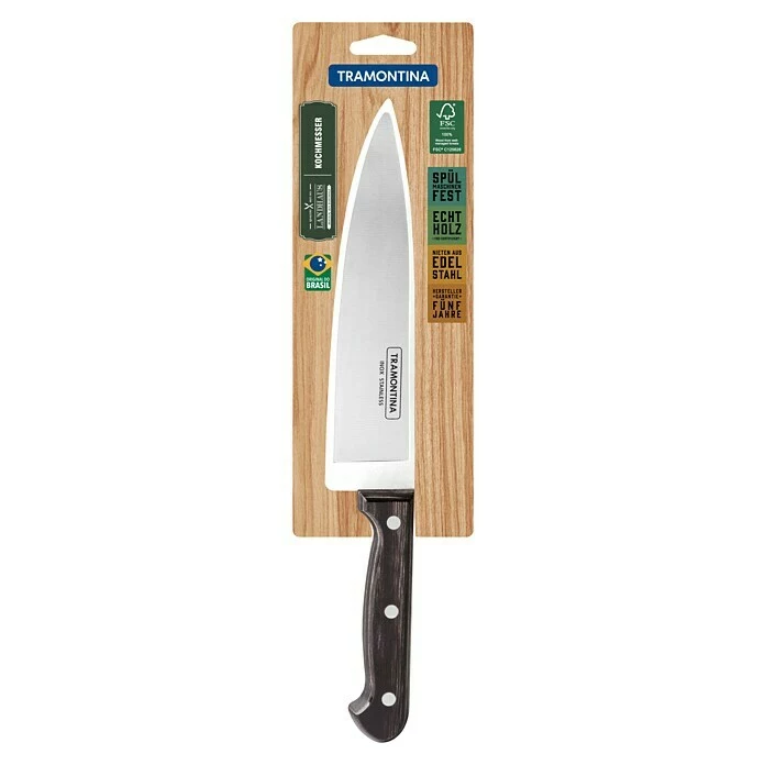 Das Küchenmesser aus der Landhaus Serie von Tramontina ist aus hochwertigem Edelstahl gefertigt, sodass es lange scharf bleibt und sauber schneidet. Der Holzgriff besteht aus mehreren Schichten Kiefernholz, die mit Harz imprägniert und unter Hitze verpresst wurden. Durch eine gute Gewichtsbalance ist selbst längeres Schneiden mit dem Messer kein Problem und ermüdungsfrei möglich. Nach Gebrauch ist es leicht zu reinigen und somit schnell wieder einsatzbereit.