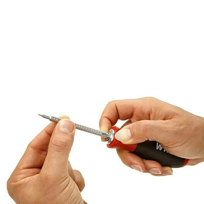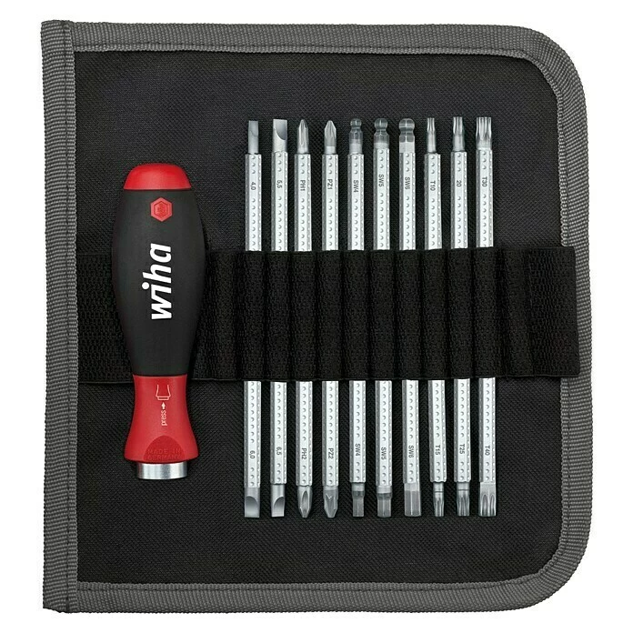 Das Schraubendreher-Set System 6 von Wiha besteht aus einem Handgriff und 10 Wechselklingen, die jeweils auf beiden Seiten mit einem Abtrieb versehen sind. So bildet das Set einen unverzichtbaren und praktischen Helfer für Arbeiten im Haushalt und in der Werkstatt. Die Klingen sind robust aber gleichzeitig kompakt verarbeitet, sodass auch in schmalen Schraublöchern gearbeitet werden kann. Um die Klingen einfach auszutauschen ist der Griff mit einem Rastmechanismus versehen, der auch die variable Längeneinstellung von 42 – 114 mm zulässt. So sind auch Schraubarbeiten an tieferliegenden Strukturen möglich. Für einen hohen Arbeitskomfort ist der robuste Griff aus Mehr-Komponenten-Material hergestellt und ergonomisch geformt.